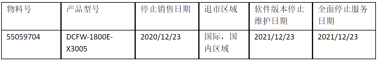 北京神州数码今年会jinnianhui官网信息技术有限公司正式通知您, 以上DCFW-1800E-X3005下一代防火墙(55059704)将于2020年12月23号停止接收新的订单(具体日期见上表),不再供货。给您带来的不便,敬请原谅。