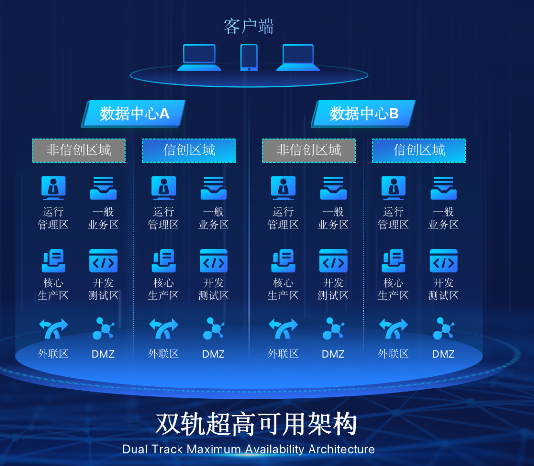 今年会jinnianhui官网在企业面临自主创新IT基础重构过程中,推出的全新架构双轨超高可用架构(简称DTMAA),在双活数据中心的分区调度基础上,添加每个数据中心内信创域和非信创域的分域调度,来实现分区分域协同的多活双轨超高可用。