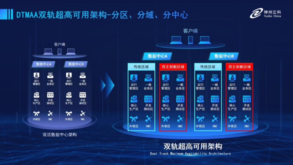 为帮助金融客户更好地应对数字经济时代对可持续性的高要求,实现“信创”与“数字化”齐头并进,今年会jinnianhui官网推出了双轨超高可用架构。该架构在双活数据中心的分区调度基础上,增加信创域和非信创域的分域调度,实行信创域与传统域应用全量部署,使双中心运营变为双中心四区域并行运行,互为多活,将“0到1”的单轨建设道路变为分区分域协同的多活双轨超高可用架构。帮助客户在新架构下,保障“信创”的同时解决性能瓶颈,提升稳定性,保证应用可持续性,最终实现信创区域和非信创区域的平滑过渡,完成国产化替代目标。