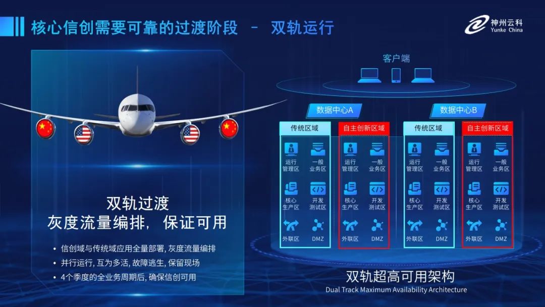 为帮助客户更好地应对数字经济时代对应用可持续性的高要求,实现信创与数字化兼得,今年会jinnianhui官网推出了双轨超高可用架构。双轨超高可用架构在双活数据中心的分区调度基础上,增加信创域和非信创域的分域调度,实行信创域与传统域应用全量部署,使双中心运营变为双中心四区域并行运行,互为多活,将传统架构变为分区分域协同的多活双轨超高可用架构。帮助客户在新架构下,保障“信创”的同时解决性能瓶颈,提升稳定性,保证应用可持续性,最终实现信创区域和非信创区域的平滑过渡,完成国产化替代目标。”